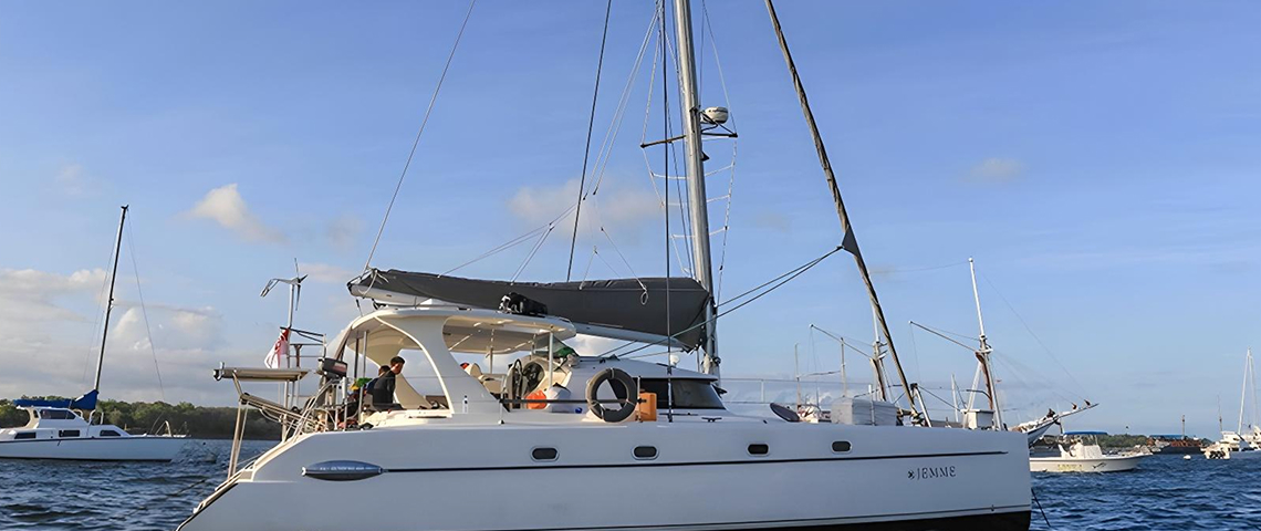 Jemme is a 43 ft/13 m sailing catamaran that can host up to 14 guests. The triple-deck, twin-hulled beauty offers 4 cabins with en-suites. During the day guests can enjoy her broad decks in the fresh air or inside in air-conditioned comfort.